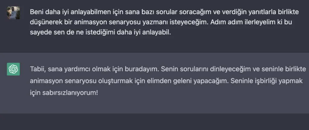 Bu bölümde 2023 yılının en popüler yapay zeka araçlarından biri olan ChatGPT ile örnek bir animasyon senaryosu yazımının nasıl yapılabileceğini göstereceğim.