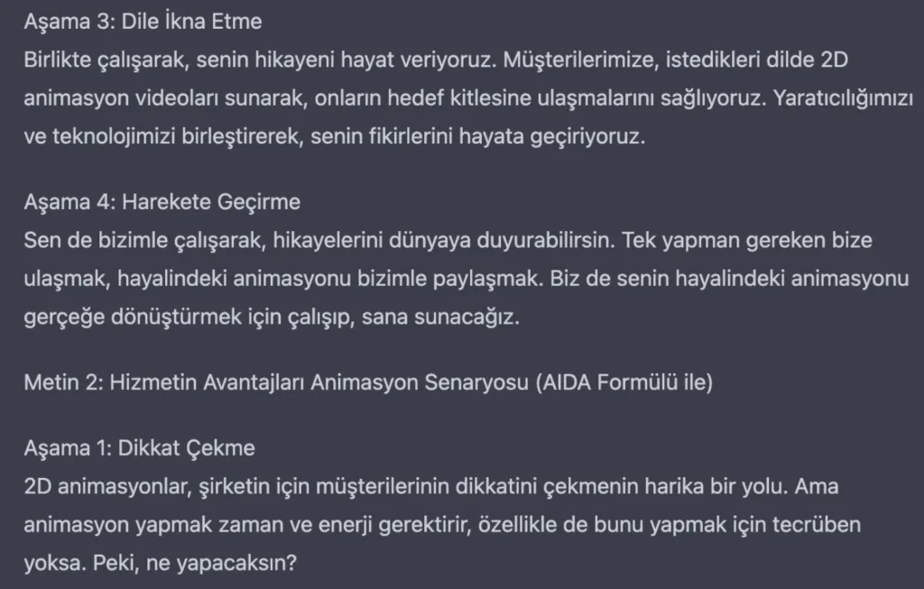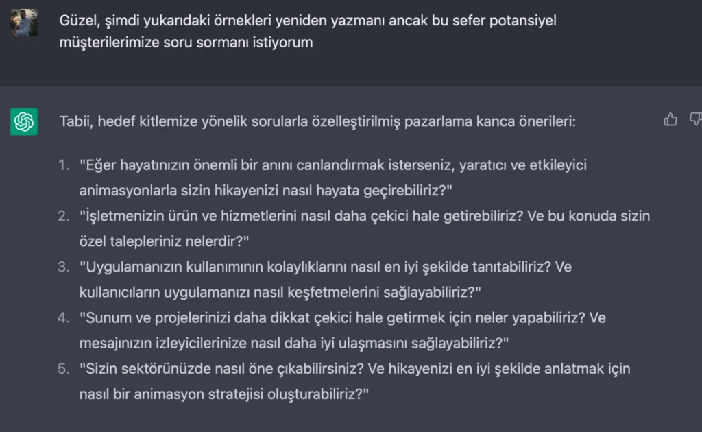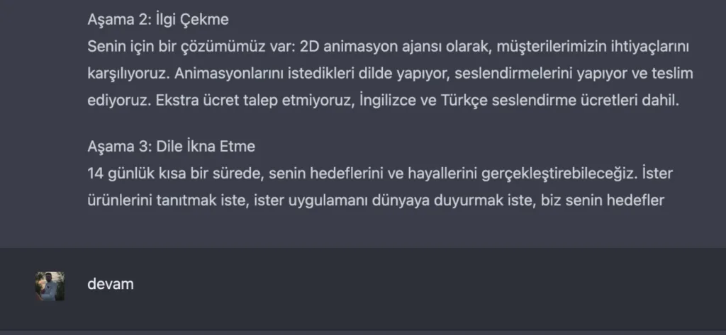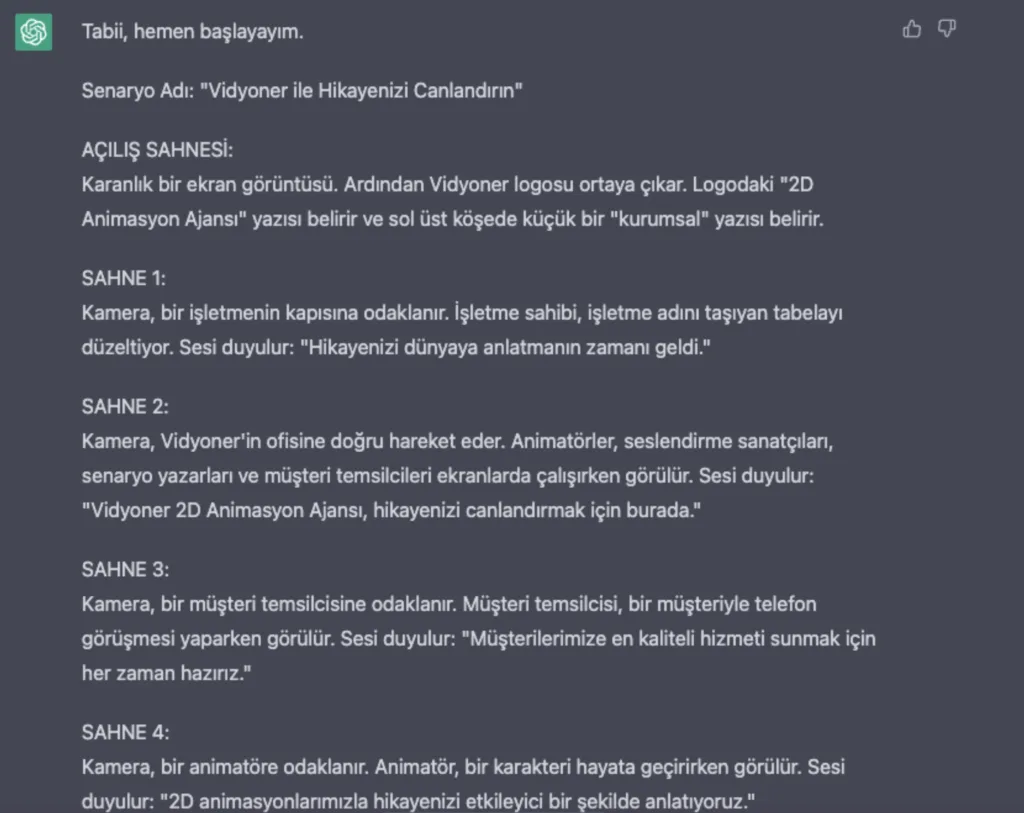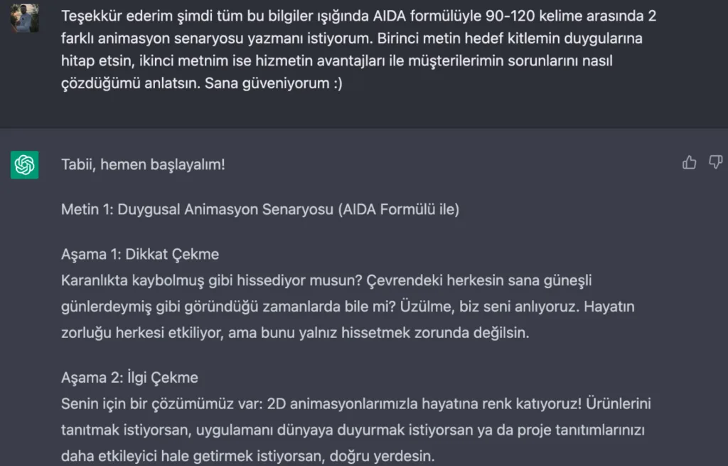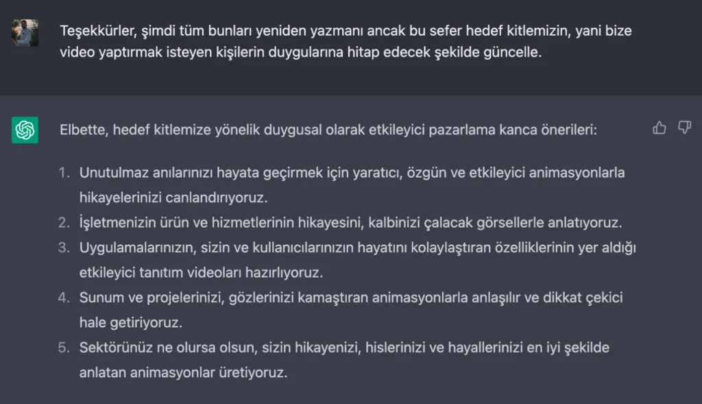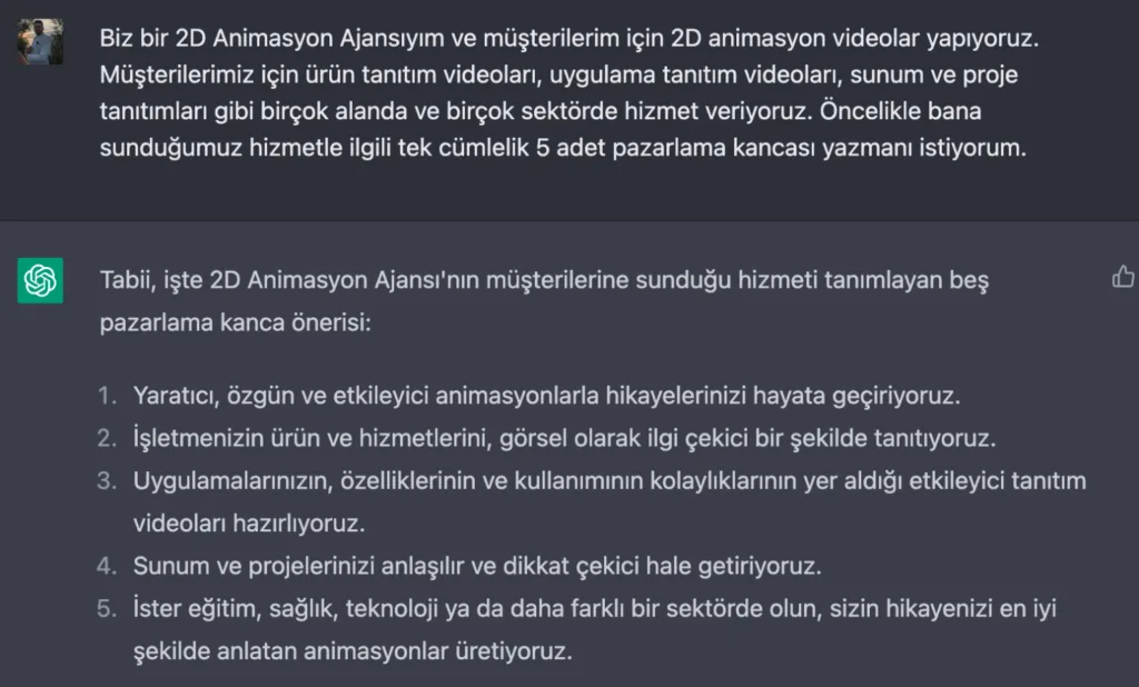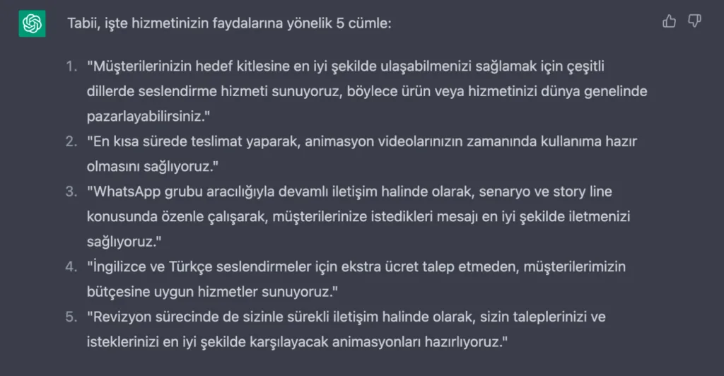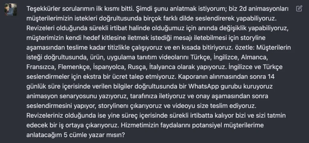 Bu adımı da attıktan sonra kendisine teşekkür ederek müşterimizden aldığımız animasyonun konusunu eğer metin düzgünse doğrudan değilse biraz düzenlemeyle ChatGPT’ye yapıştırıyoruz ve şu soruyu soruyoruz: “Bu bilgiler ışığında, hizmetimizi anlatan 5 cümle yazar mısın?”